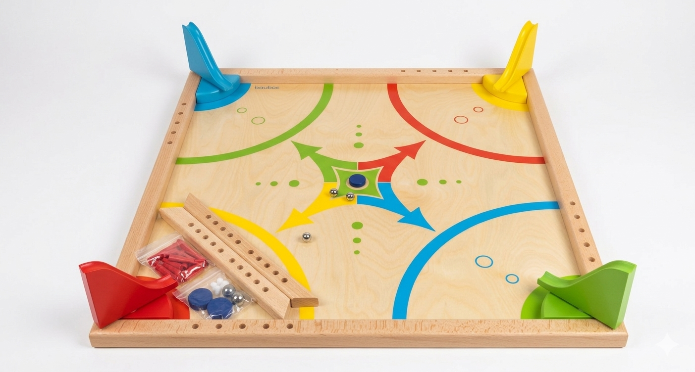 Doel: Duw de blauwe houten schijf in je eigen kleurenveld. Met behulp van de metalen ballen verschuif je de blauwe schijf.  Dit wordt al snel spannend, want het is niet zo makkelijk om te schijf te raken – en je tegenstander speelt ook nog eens mee!