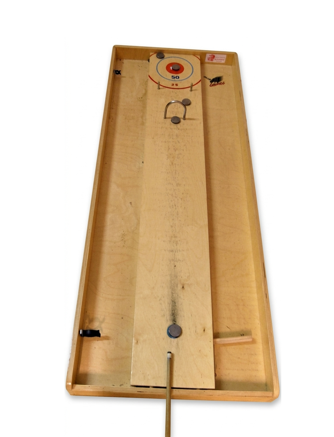 Door middel van een biljartkeu de 6 metalen schijven over het spel schuiven en proberen punten te scoren.